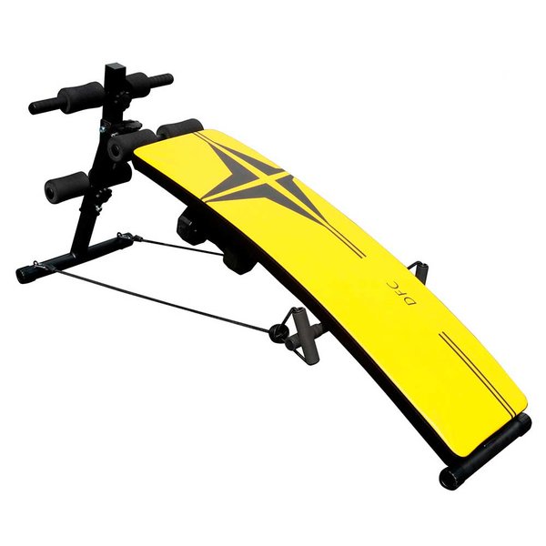 Скамья для пресса DFC D102RY. Тренажер предназначен для домашнего использования. Изогнутая поверхность, складная модель. В комплекте 2 гантели и 2 эспандера. Удобные рукоятки для упора. Надежная стальная конструкция. Удобные валики. Регулируемый угол наклона скамьи.